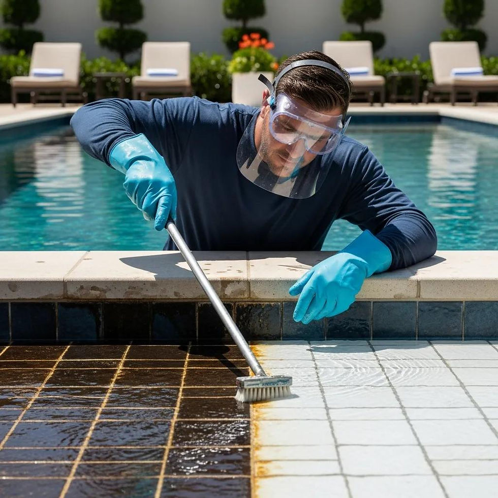 Professional acid washing is a controlled cleaning method that uses a diluted acid solution — most often muriatic acid — to dissolve mineral deposits, algae stains, and other surface contaminants on pool tiles. When applied and rinsed correctly, the treatment restores tile color and shine and makes scrubbing more effective. Done well, it improves both the look of your pool and the conditions that discourage algae and buildup.